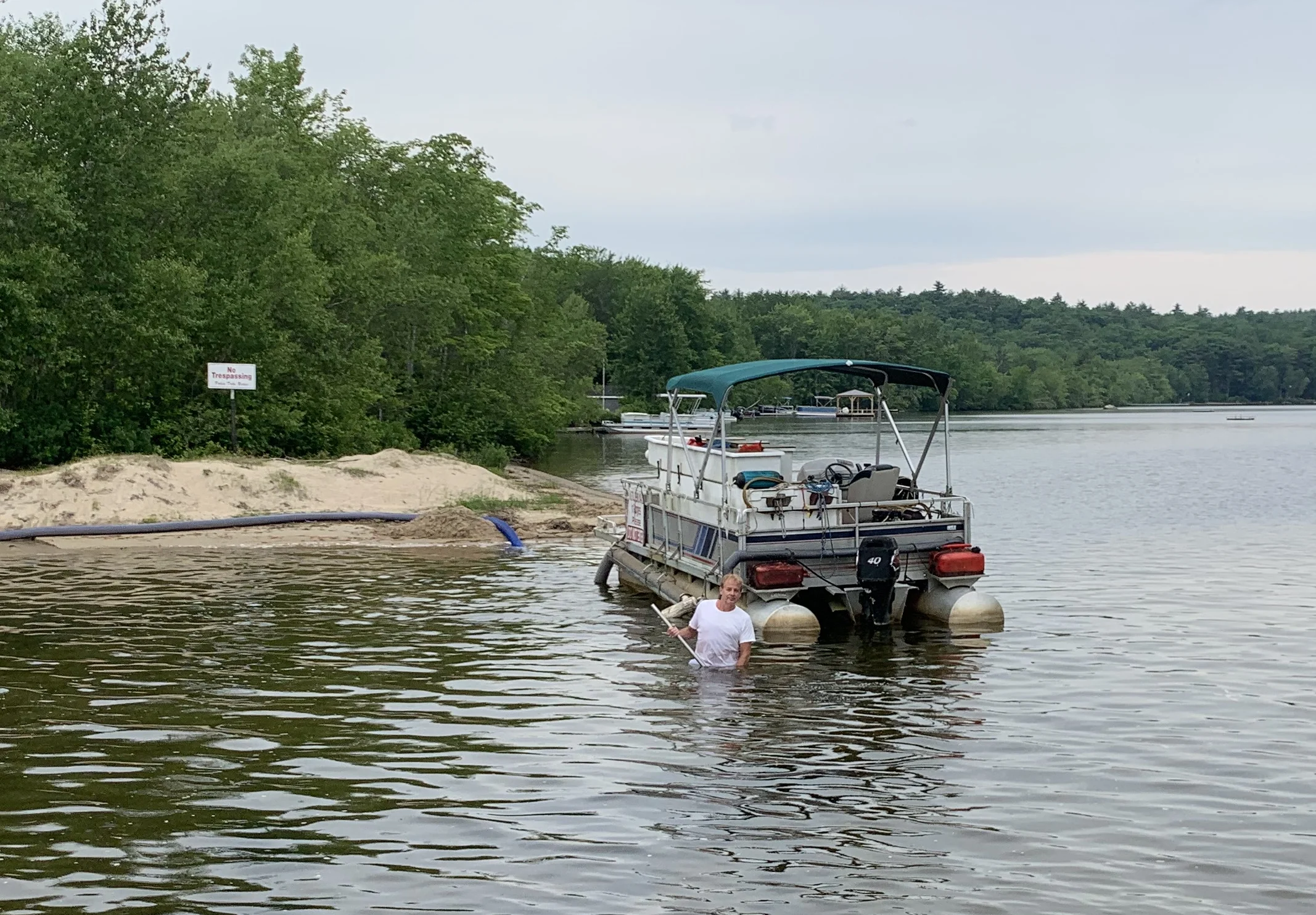 The lower narrows (aka, sandy narrows) has for years needed attention to remove the sand that builds up over time. If the removal is not done regularly, then the lower lake residents would not be able to enter the middle lake with their boats. Working by permit under the authority of the DEP, volunteers work to keep the narrows open and navigatable.